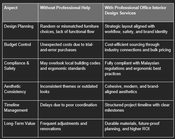 Below is a simple breakdown illustrating the contrasts between managing your own office setup and hiring a qualified interior design service provider in Kuala Lumpur: